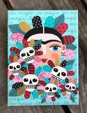 MAGICAL series - Frida with Skull Flowers 6"x8" canvas painting